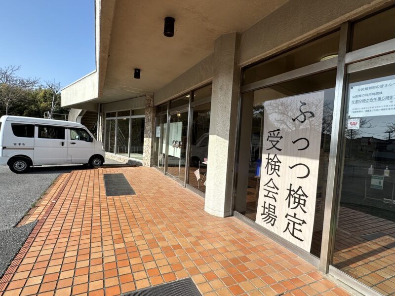 試験当日、集合1時間前に会場の富津公民館に到着するも、「本日休館」の看板がドアにある!! え〜? 慌てて問い合わせ電話番号にかけると、第一声が「富津中央公民館です」だった。吾輩の思い違い、会場は富津市中央公民館だったのである。ちょっと動揺。