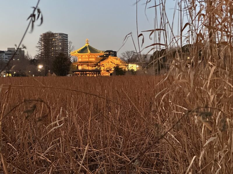 上野・不忍池にある辯天堂は、暗くなるとライトアップされる。